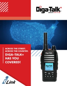 CONNECTIVITY CLARITY SECURITY DURABILITY SAFETY ACROSS THE STREET. ACROSS THE COUNTRY. DIGA-TALK+ HAS YOU COVERED! Economical Mobile and Portable Push-To-Talk Two-Way PoC Radios with long-range coverage Diga-Talk+ offers competitively priced two-way digital communication services and devices with nationwide coverage, including in-stock mobile, portable and FirstNet Ready™ devices. Stay In Touch with the Push of a Button Let Diga-Talk+ save you money and improve operations by leveraging its state-of-the-art two-way radios and services. Why Choose Diga-Talk+? Link 800-753-4412 WWW.ILINKPTT.COM